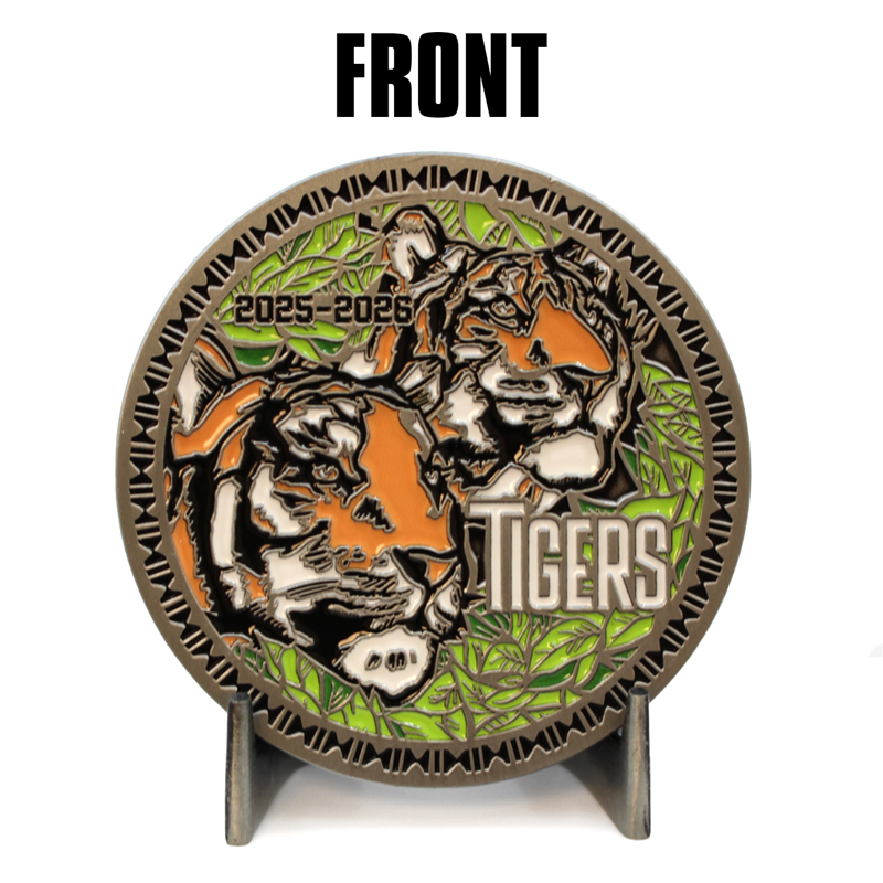 $100.00 Level: Coin/Stand - 2.5" diameter coin featuring an Animal Adventure Park & Preserve tiger layout with antique silver stand for easy display.