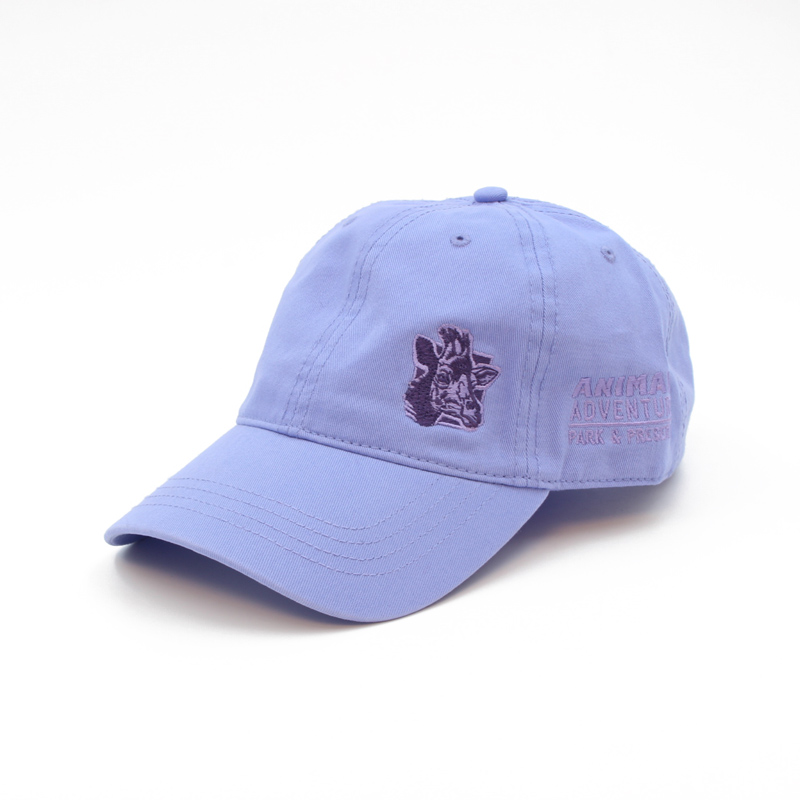 Perched on the crown of the hat, an embroidered giraffe head gazes serenely forward, it's gentle eyes and lofty grace turning mere fabric into a quiet tribute to wild elegance and sunlit horizons. The Animal Adventure Park & Preserve text compliments the design on the left side of the hat. Low profile six panel structured cap, cotton twill.