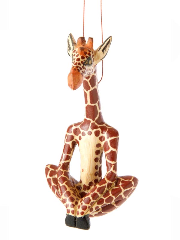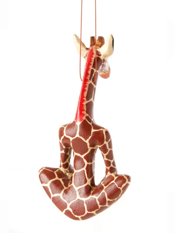 Kenyan wood carvers hand carve a playful ornament in jacaranda wood, portraying a giraffe as a yogi in a lotus pose. The attached string makes it easy to hang this unique ornament on the holiday tree or anywhere in the home, office or studio.
