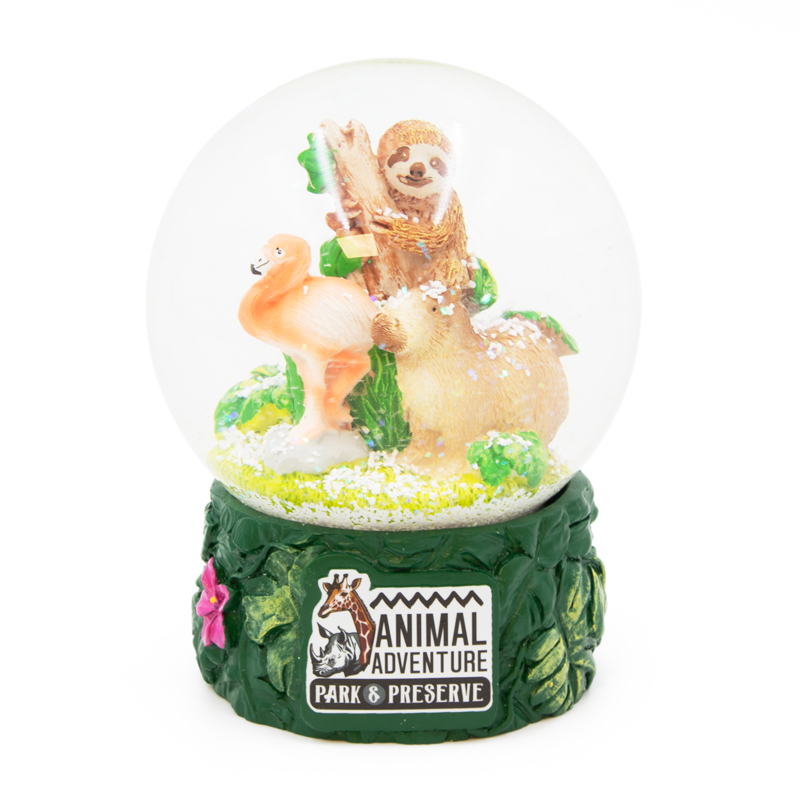 You'll love the bright colors and fine detail of the leafy, flowered base and then you'll smitten by the adorable renditions of the flamingo, capybara and sloth within the water dome. Our Animal Adventure logo is featured prominently on the base in vibrant full color. This stunning masterpiece is perfect for year-round display - pick up yours today - limited quantities!