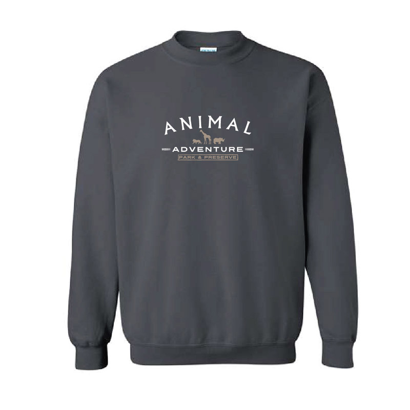 A charcoal crewneck, soft and worn like a memory, carries a delicate design — a lion, giraffe, and rhino standing together inbetween gentle lettering that reads Animal Adventure Park & Preserve.