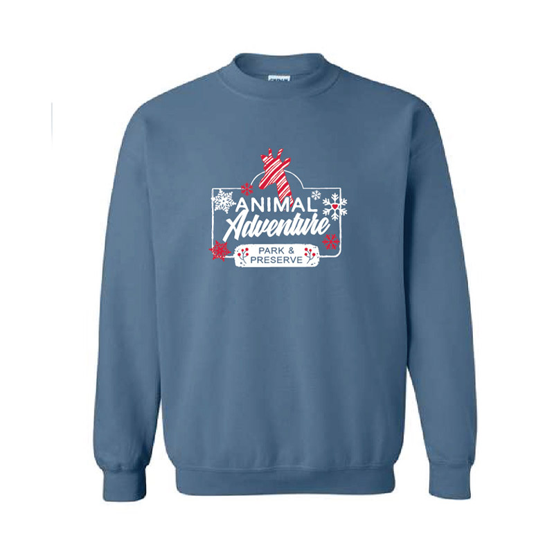 This indigo blue crewneck, deep as winter twilight, holds a candy-cane-striped giraffe beneath a drift of delicate snowflakes. Its playful pattern glows against the dark fabric, like laughter in the hush of falling snow. Slip it on, and it feels like a love letter to cozy nights and quiet joy. Fun to wear for the holiday season!