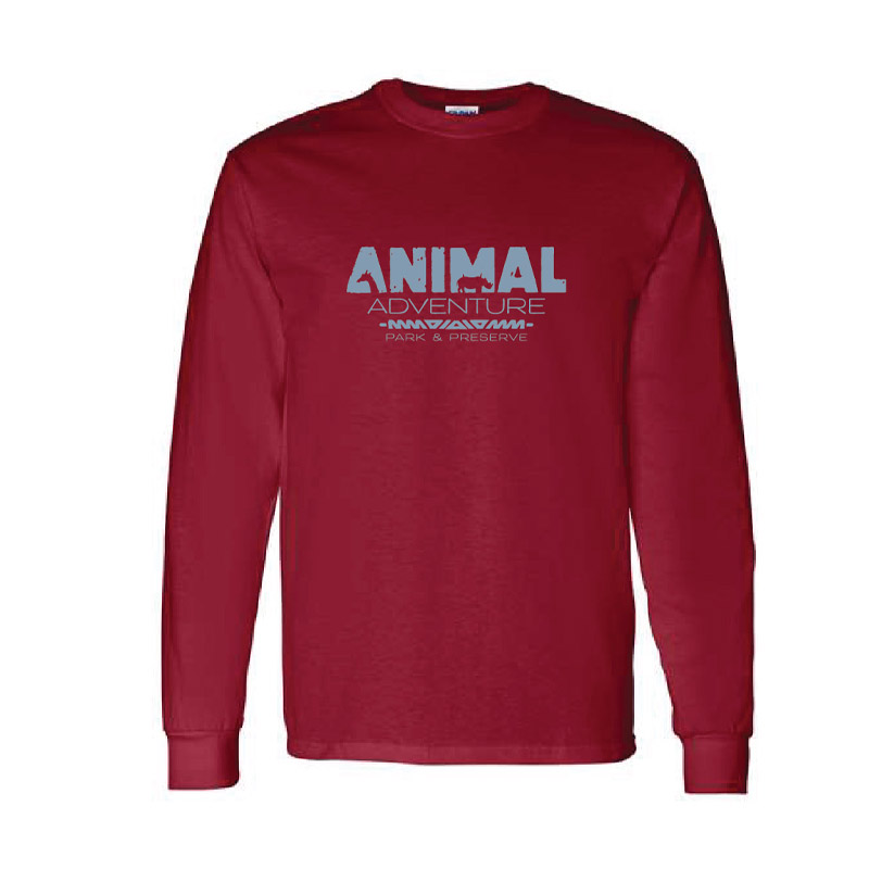 New for 2025 - This Garnet Long Sleeve Tee burns with the spirit of exploration, its deep hue echoing the heartbeat of the wild and the thrill of untamed horizons. Across the chest, “Animal Adventure Park & Preserve”.