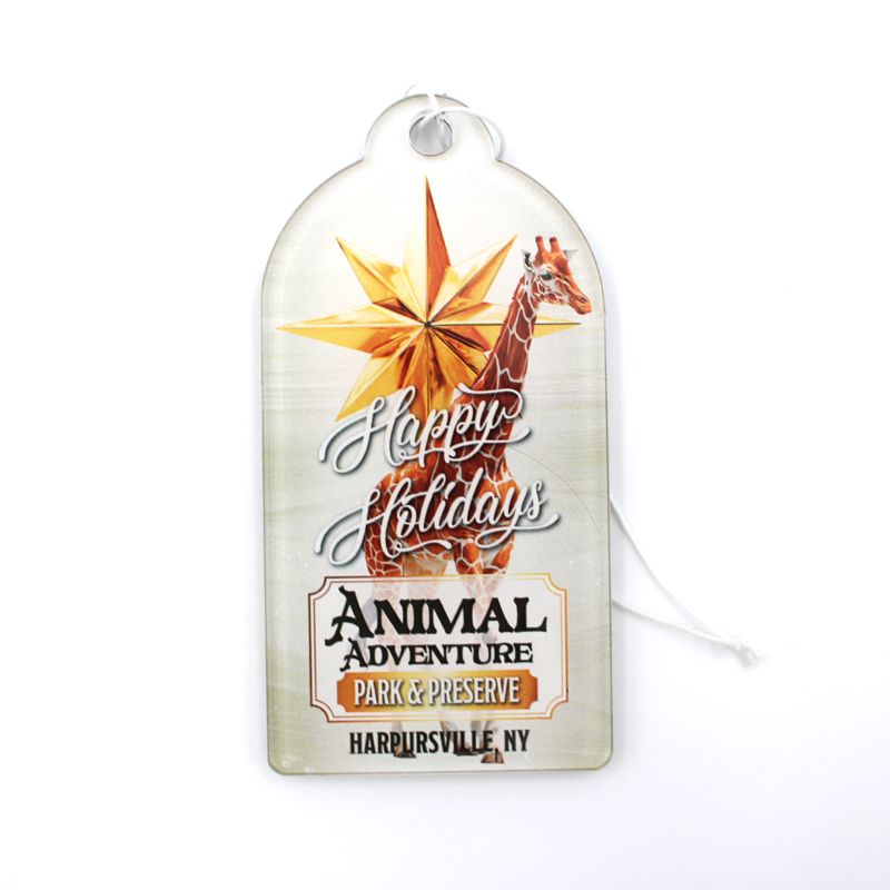 Animal Adventure Park & Preserve's custom giraffe ornament for 2025! Our giraffe tower remains a guiding light for many, and the stars of our parks! The ornament is 7" sq., on 1/8” thick clear acrylic, with 1/16” thick mirrored acrylic backing.
