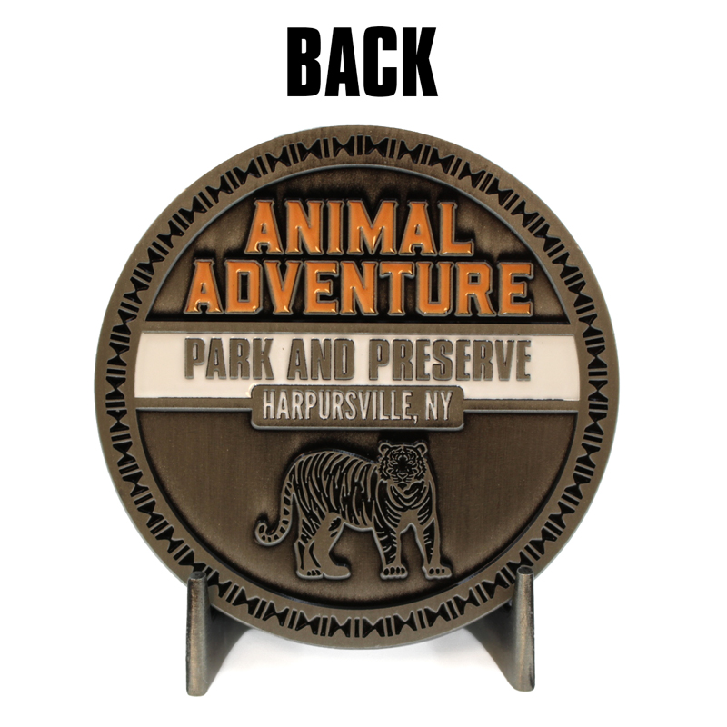 $100.00 Level: Coin/Stand - 2.5" diameter coin featuring an Animal Adventure Park & Preserve tiger layout with antique silver stand for easy display.