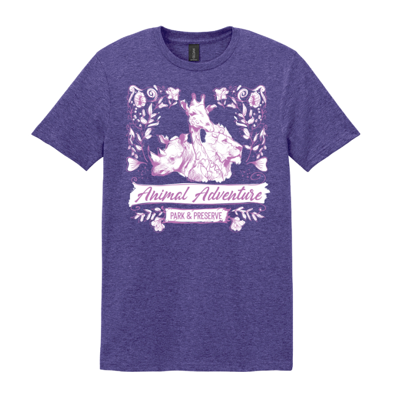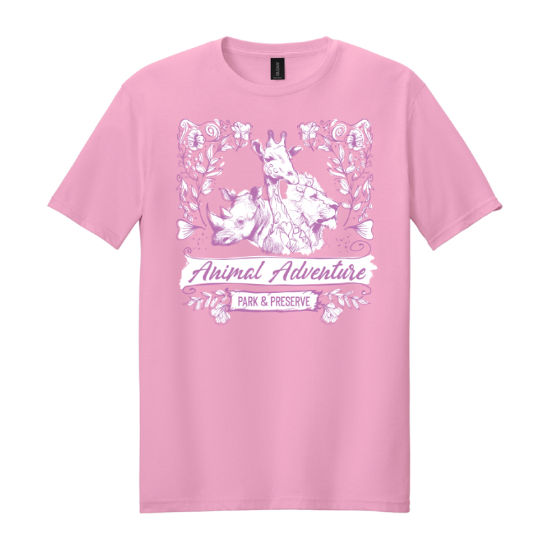 It’s more than a T-shirt—the rhino and lion stand like quiet guardians on either side, while the giraffe in the middle rises gently among soft, blooming florals. Beneath them, “Animal Adventure Park & Preserve” feels less like text and more like a whispered memory of warm air, wandering paths, and the hush of something beautifully untamed. Wearing it feels like carrying a small, wild garden with you—where strength, grace, and softness all exist in perfect harmony.