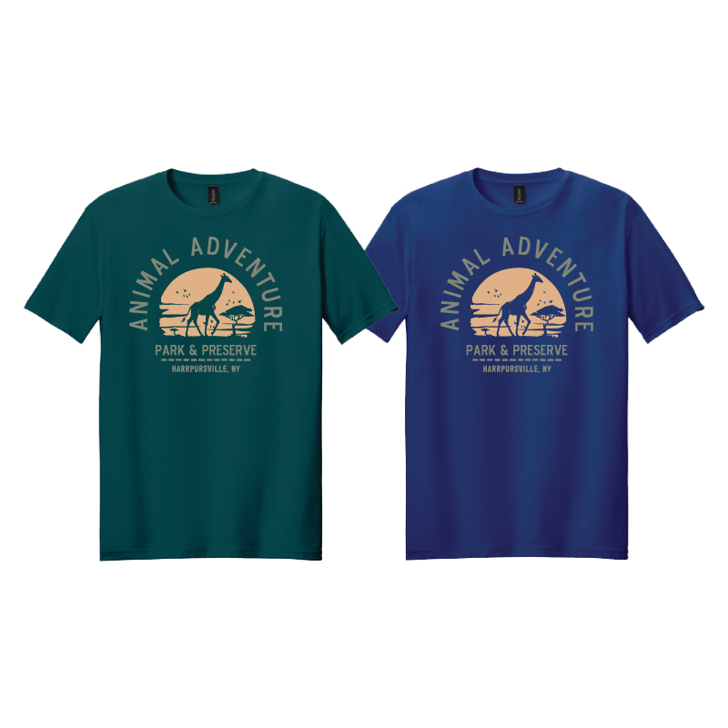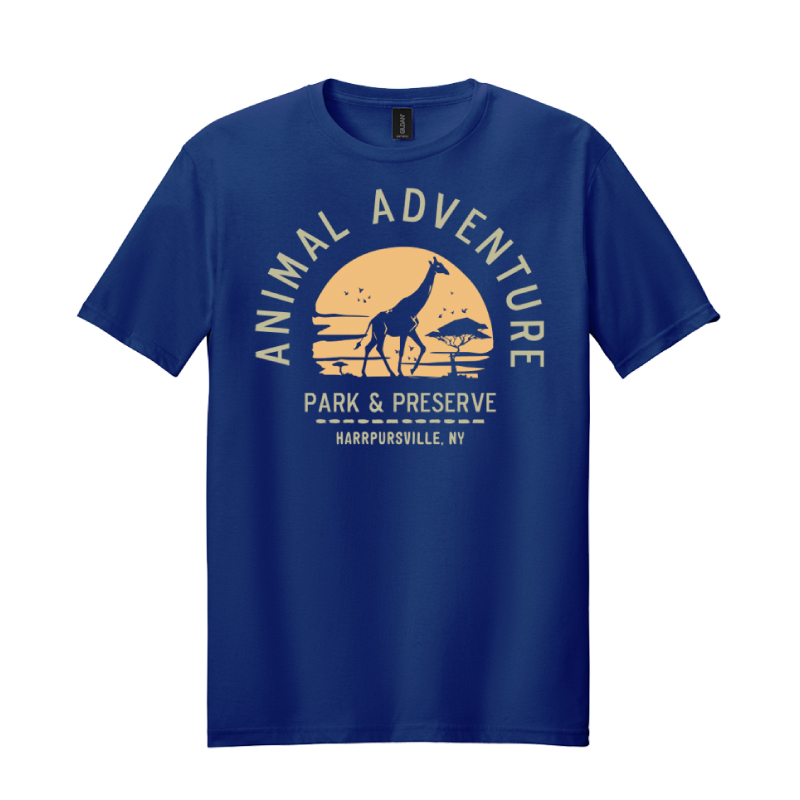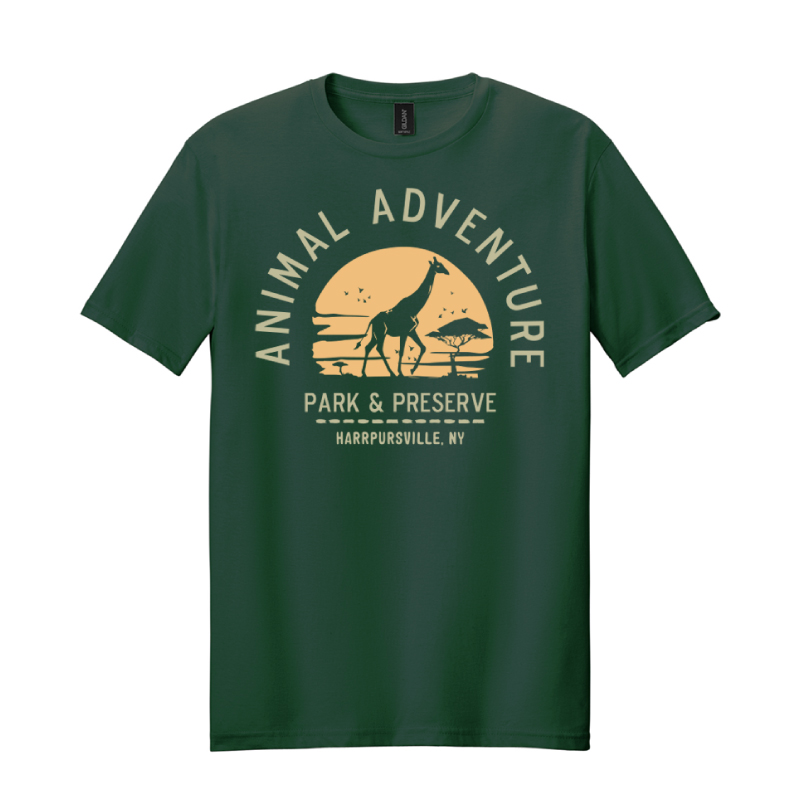 It’s not just a T-shirt—the giraffe stands silhouetted in the heart of a savannah sunset, where the sky melts into gold and the world feels endless. “Animal Adventure Park & Preserve” curves around it like a horizon, holding the quiet hum of distant wildlife and the warmth of a fading day.